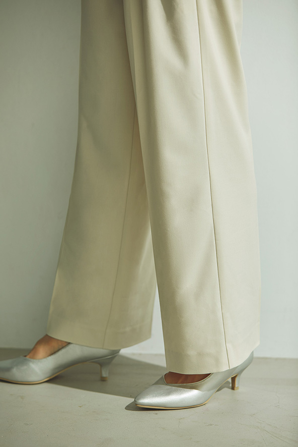 膝から裾にかけてまっすぐなラインを描くことでより自然な美脚シルエットに。フロントのタックは1つにしており、余分な生地がうまれずスッキリ。