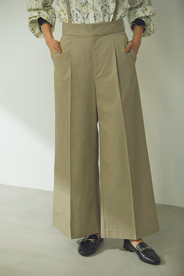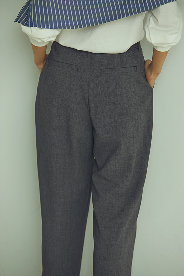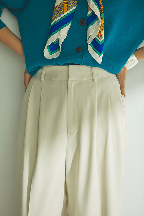 タックをひとつにすることで、余分な布がなくなり腰まわりがスッキリ。動きやすさはそのまま、気になるパーツの華奢見せが可能に。