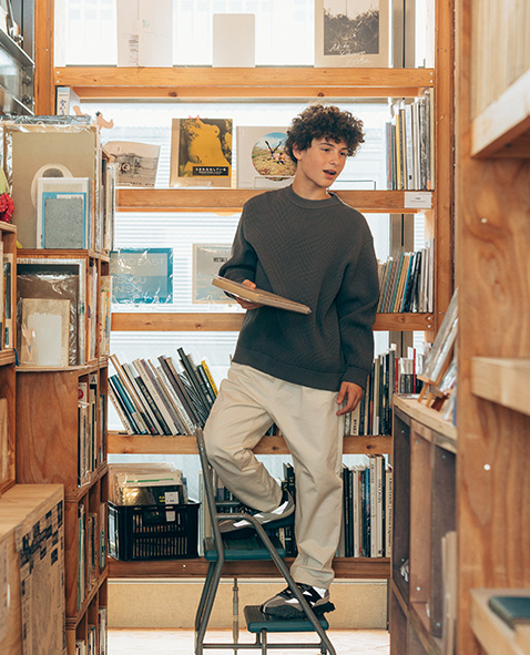 自分だけの秘密基地のような本屋さんでクラスメイトにバッタリ遭遇。【GIRL】ネクタイ付きのシャツをアクセントに、ハイピングが目を引くブルゾンを合わせて。【BOY】大人っぽいこなれ感が手に入るワッフルニットに、ゆるいイージーパンツでリラックススタイル。