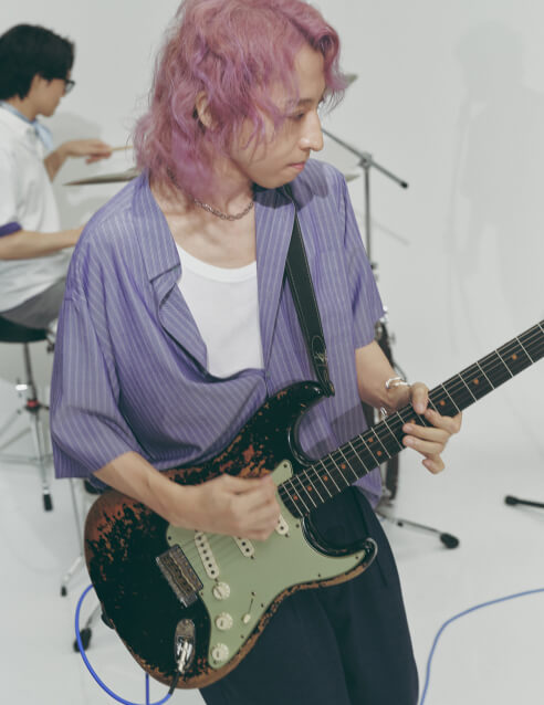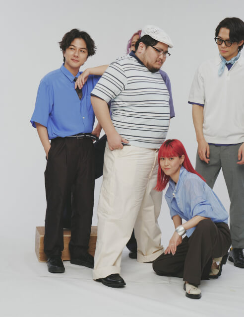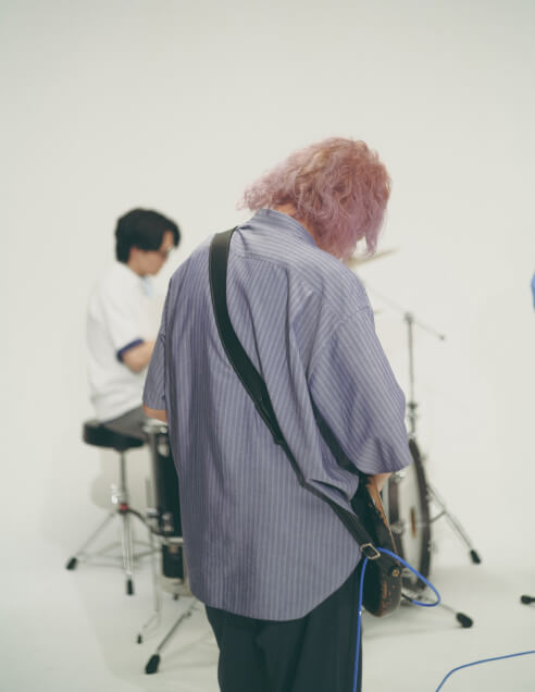 チャレンジするのは楽しいよね。僕はアー写で着てた派手なセットアップが気に入ってる。もともと存在感のある服が好きで……その中にかわいさも欲しい。そういえば「ただ派手なものを着るんじゃなくて色の組み合わせ方を考えるべき」と、下北沢の定食屋で平井さんから指導を受けたのが良かった。ちゃんと全身の配色を意識するようになりました。