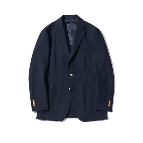 〈リングヂャケット〉のブレザーを基にした「スタンダードフィット」の一着。肩パッドを省いたナチュラルショルダー、柔らかく軽やかなアンコン仕立て、3つボタン段返りのフロントや金ボタン、腰のパッチポケットなど、いつの時代も色褪せないアメリカントラディショナルな面持ちです。生地はザックリと織り上げた粗めの豊かな表情を楽しめ、通気性がよく、シワも目立ちにくいポップサック。定番のネイビーに加えてブラックも新登場します。