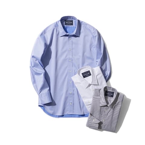 エレガントなブロード生地、〈リングヂャケット〉の特長である前肩体型にフィットする立体パターンのスリムシルエットなど、その仕立ては上に紹介したレギュラーカラーと共通。一方、襟型は首元がスッキリと見えるワイドカラーに。タイドアップだけでなくノータイでもバランスよくキマるため、より幅広いスタイリングを楽しめます。洗濯後もほとんどシワにならずアイロン掛けを省けるので、ケアの手間がなく気軽に着られるドレスシャツです。