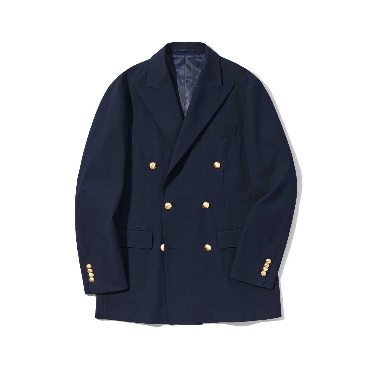 昨シーズンに初リリースし、さっそく多くの支持を集めたダブルブレステッドのブレザーが引き続き登場。シングルフロントのタイプと同様の「スタンダードフィット」をはじめ、肩パッドや芯地を極力排したアンコン仕立てのナチュラルショルダー、ホップサック生地、金ボタンも共通です。対して、襟はピークドラペル、腰ポケットはフラップ式へと変更し、より精悍でドレッシーな佇まいに。背抜きライニングなので季節を問わず活躍します。