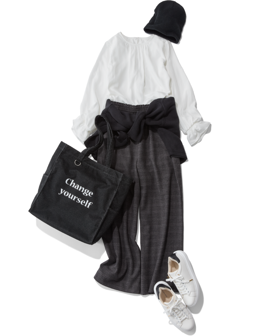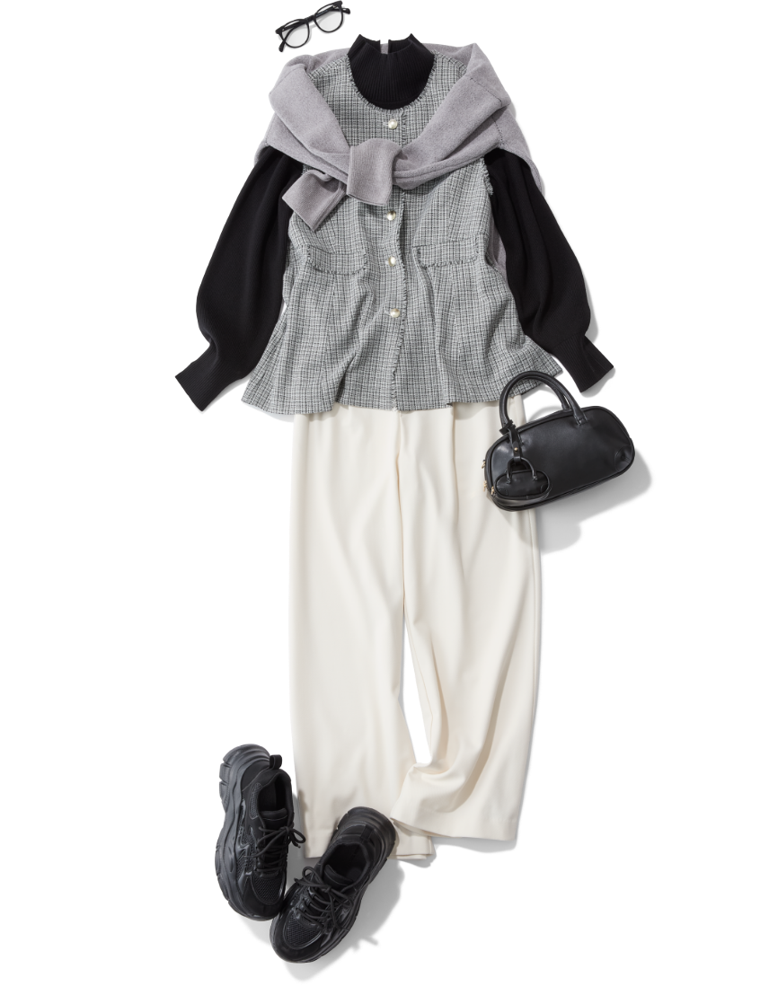 ジレを軸に、モノトーンでまとめてすっきりと。寒い時季はニットをインナーに。肩がけニットのプラスαでこなれ感がアップ。暖かくなってきたら、ブラウスやロンT合わせもあり!