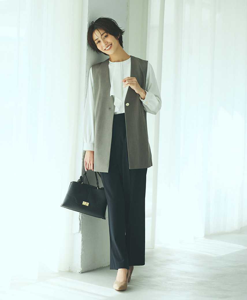 ジレとパンツ、どちらもほどよいとろみ素材なので、きちんと感がありながら、やわらかな親しみやすさもさり気なく。ブラウスはインしてメリハリを。脚長にスタイルよく。