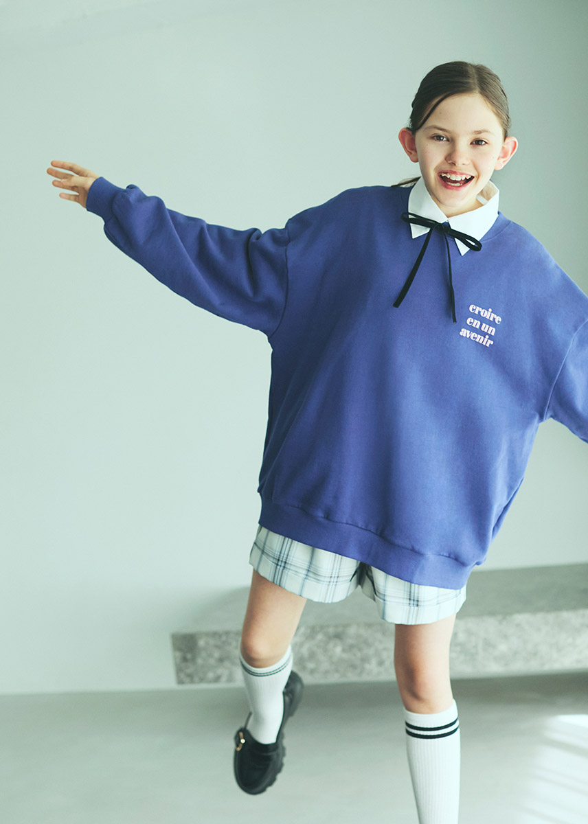 大きめのスウェットから、ブラウスの襟をのぞかせることで、カジュアルすぎないバランスに。華奢なリボンタイがアクセのかわり。ガールな心を満たしてテンションも上がりそう!