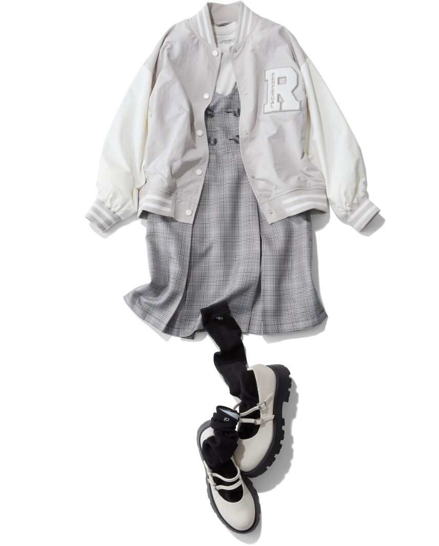 かっちり、上品イメージなチェック柄のジャンスカも、ボーイズライクなアウター羽織りで一変。ほかにもスウェットを重ねたり、薄手のニットをインしたり、レイヤードで色々使えます。
