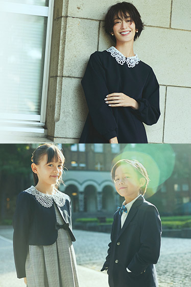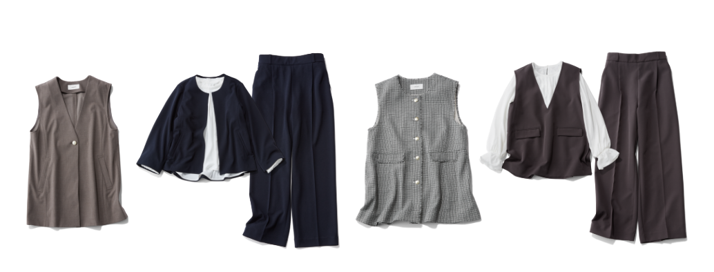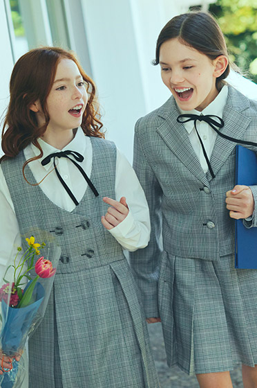 目指したいのは、正統派の印象から外れることなく、自分らしさも大切にできるスタイル。たとえばこんなふうに、ジャケットのかわりにジレを選んでみたり。女の子はコーデいらずのセットアイテムで、イージーケアもうれしいポイントです。