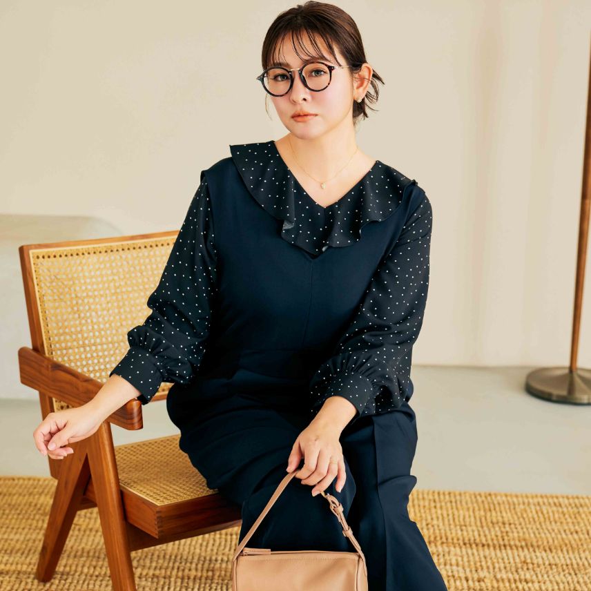 取り外せるレース襟付きのペプラムブラウスと、テーパードパンツのセットアップは、ストレッチ性のあるダブルクロス素材で、上品な見た目と動きやすさを両立。1着でさまざまなシーンで活躍します。