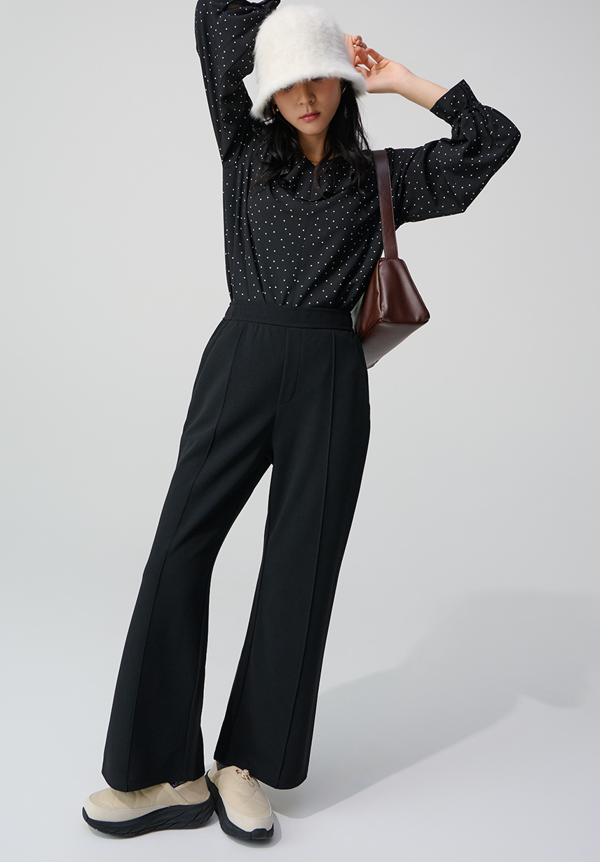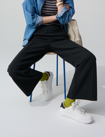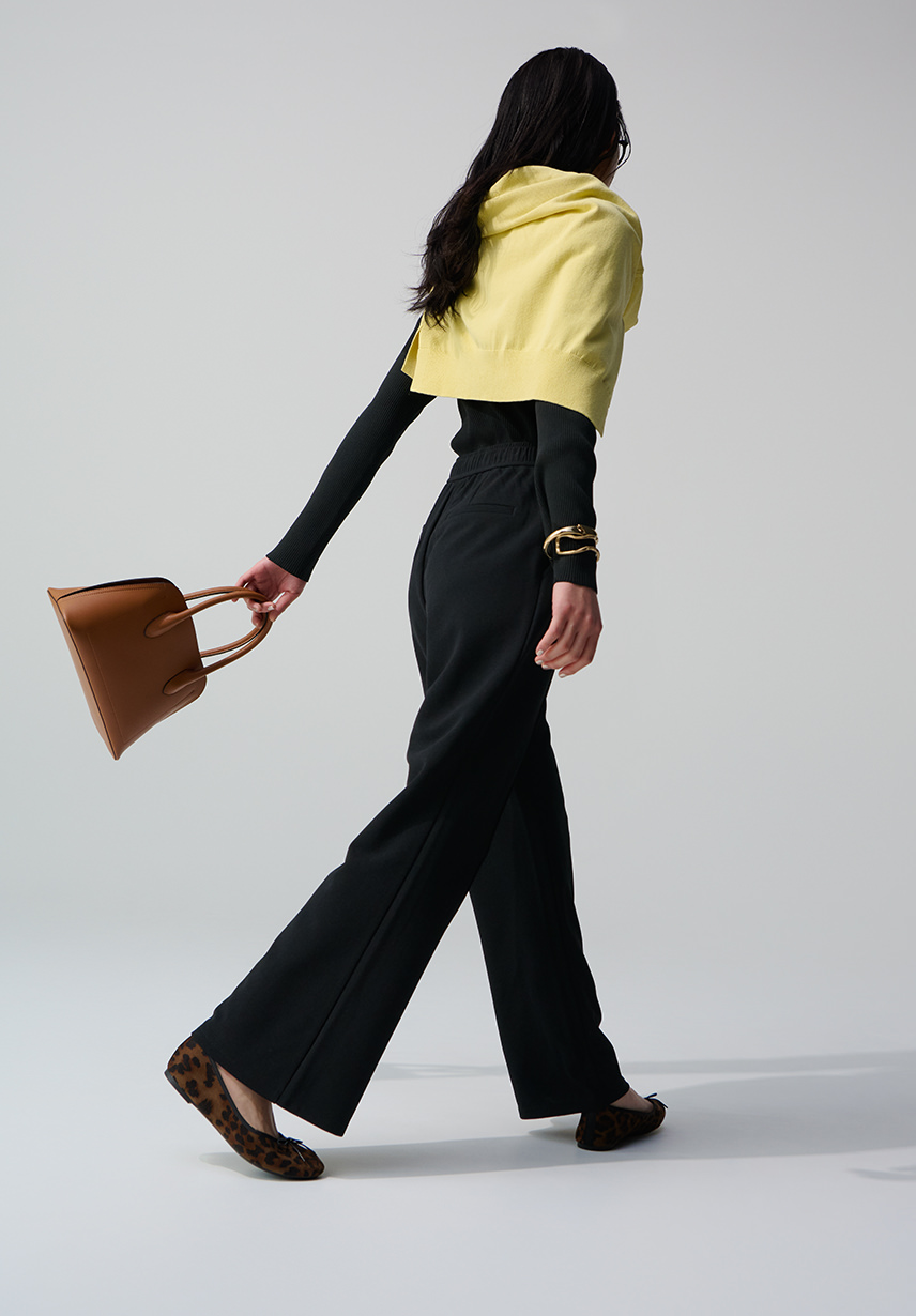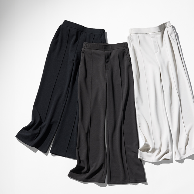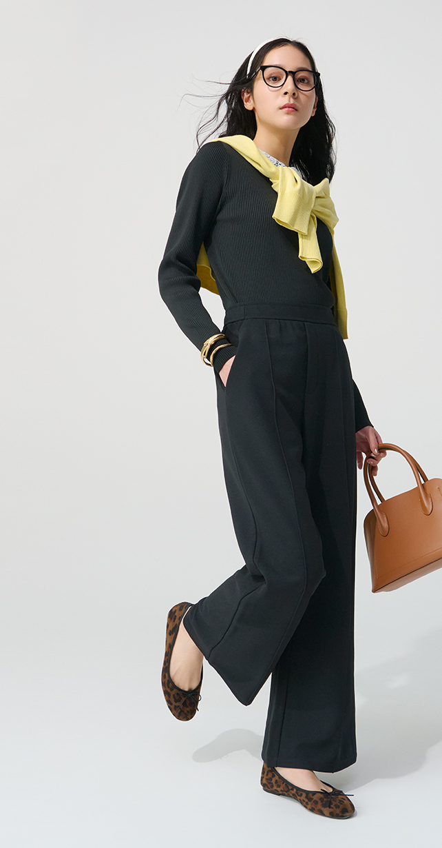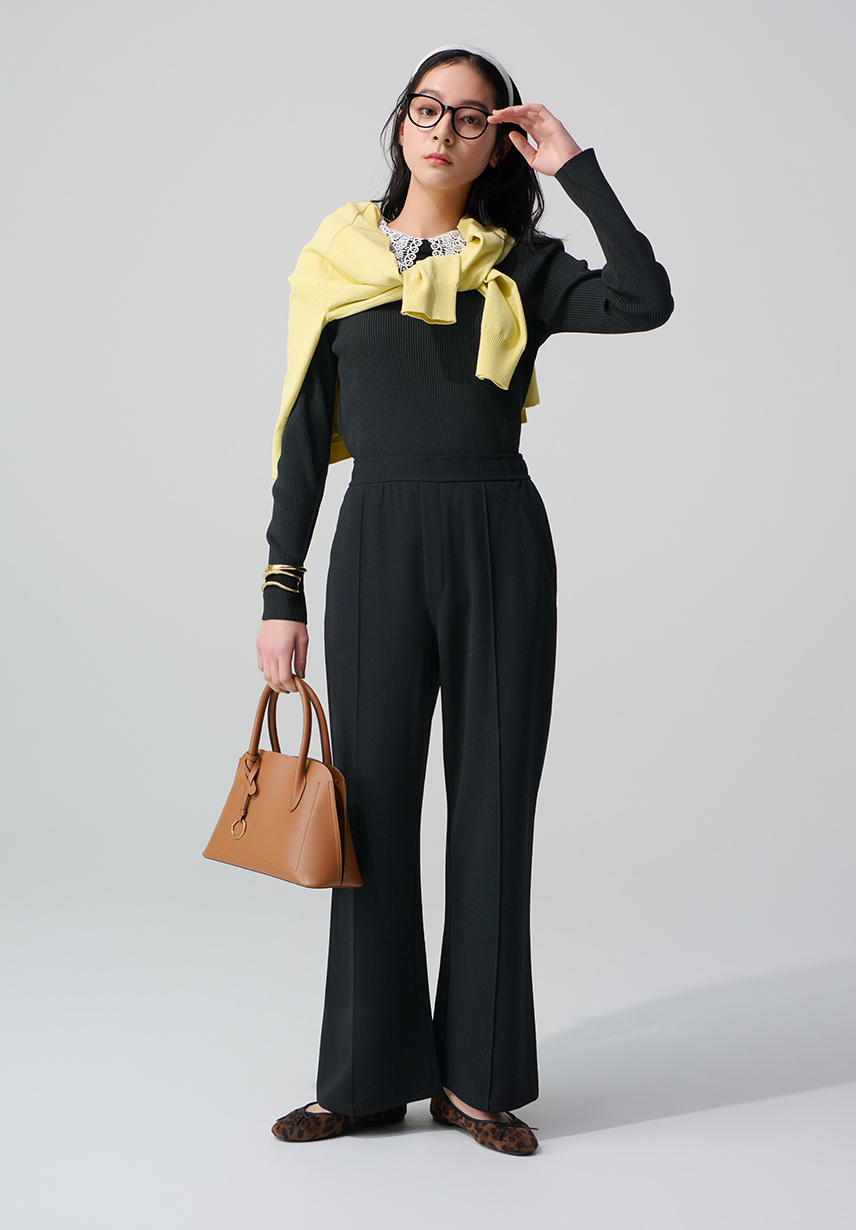 フレアシルエットに、センタープリーツが脚長効果を後押し。ダークトーンでまとめながら、上に差し色のポイントを作ることで、よりスタイルアップして見えます。肩巻きニットは、今季らしいミルキーな色を選ぶのもポイント。