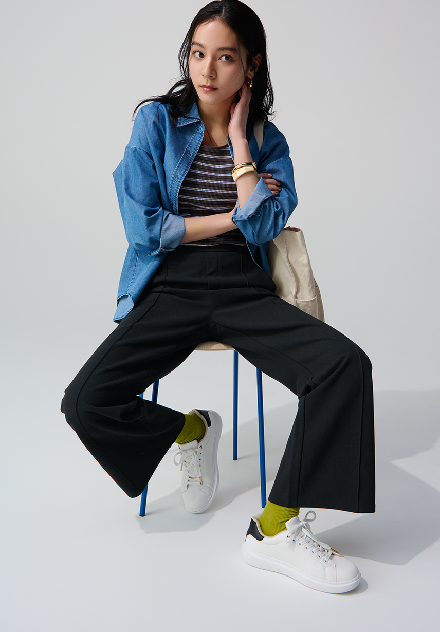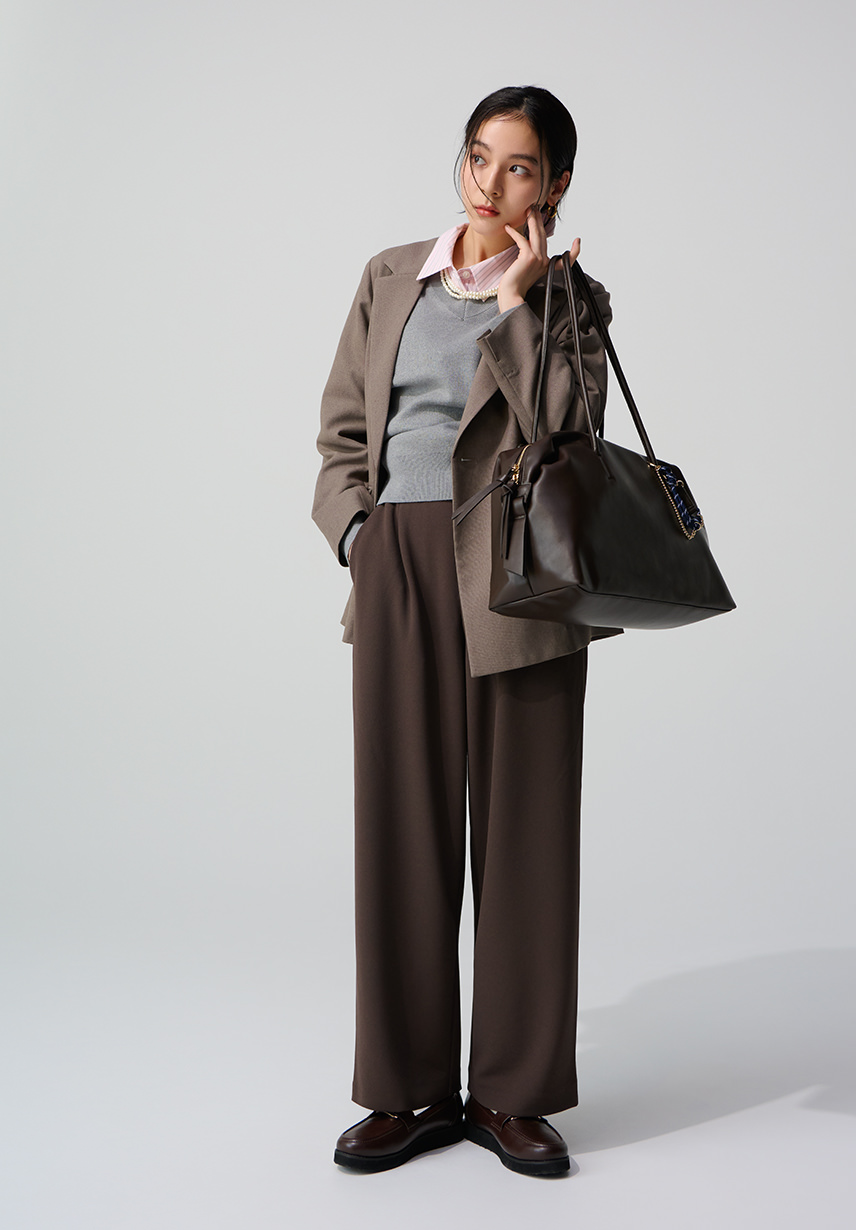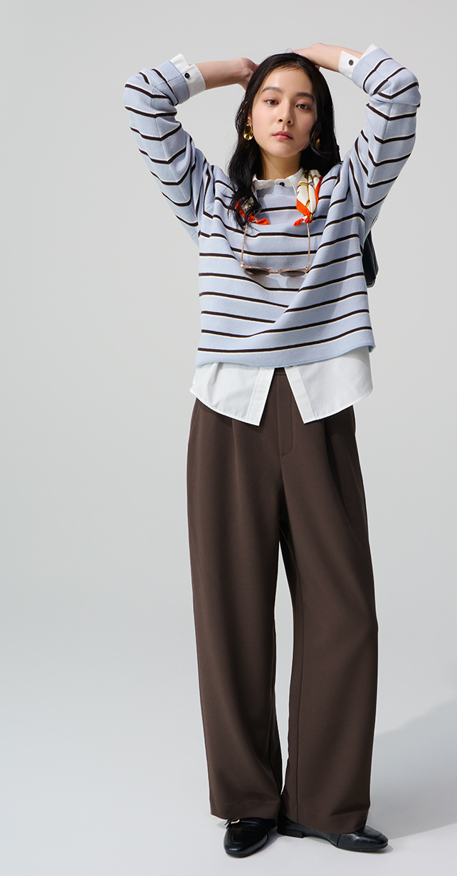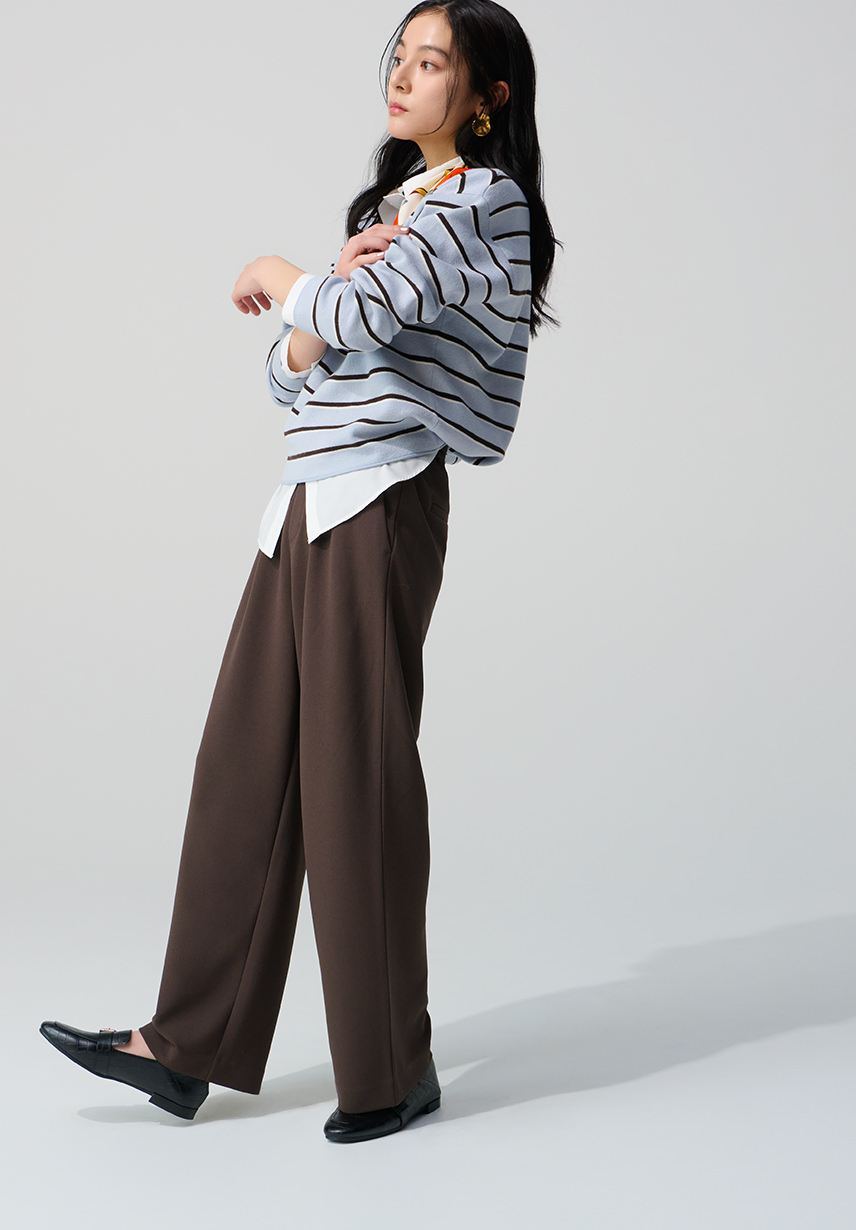 今季らしいワイドシルエットと、柔らかなドレープのある素材で、こなれ感が抜群。短め丈のニットを合わせることでパンツの魅力が引き立ちます。温かみのあるブラウン×爽やかなブルーという配色も、春を始めるのにオススメの掛け合わせ。