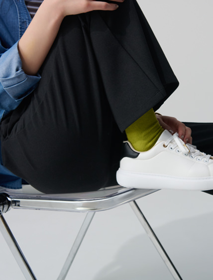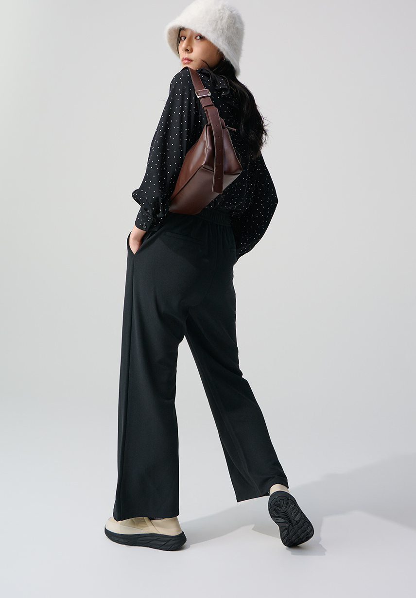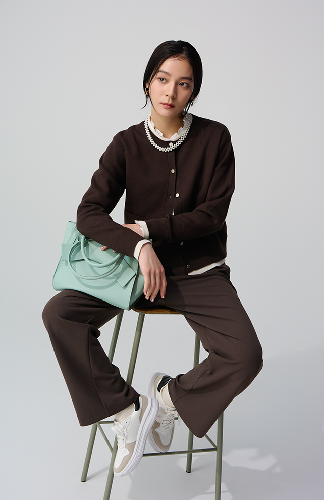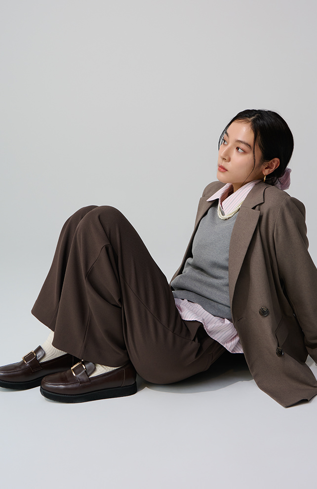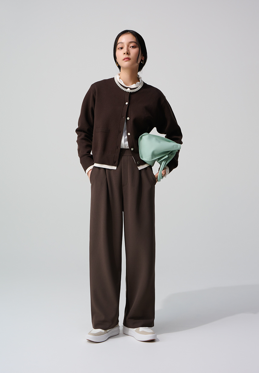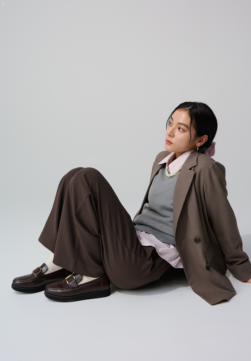 今季らしいワイドシルエットと、柔らかなドレープのある素材で、こなれ感が抜群。短め丈のニットを合わせることでパンツの魅力が引き立ちます。温かみのあるブラウン×爽やかなブルーという配色も、春を始めるのにオススメの掛け合わせ。