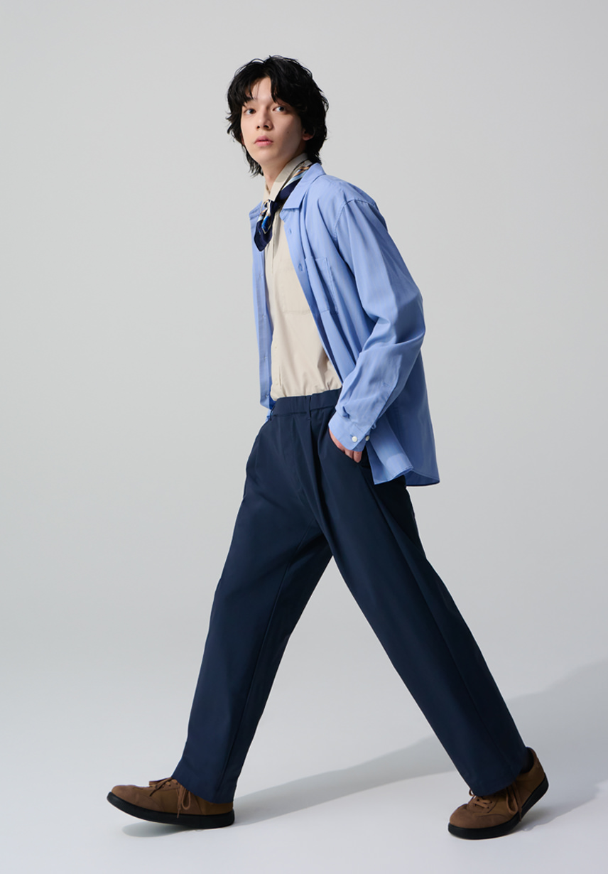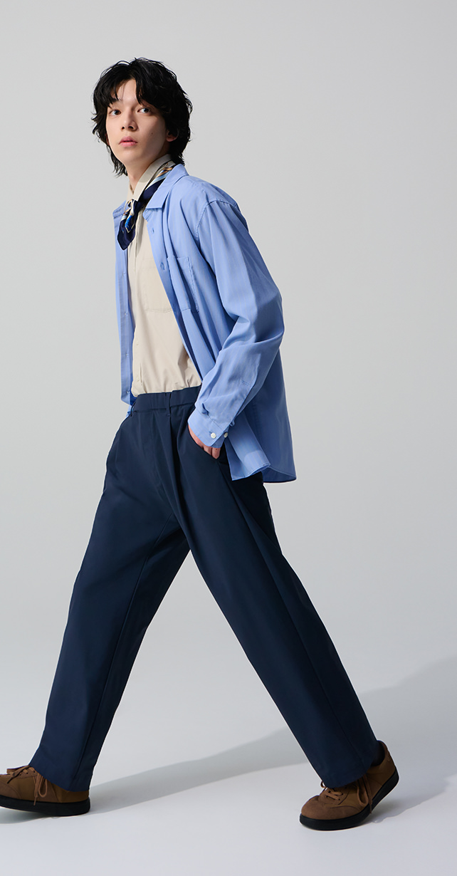 クリーンな着こなしにも馴染むきれいなテーパードシルエットが特徴。トップスはシャツonシャツで、清潔感をキープしながら旬の雰囲気にアップデートしたのがポイントです。ちょっとしたお出かけなら、スカーフを差して華やぎもプラス。