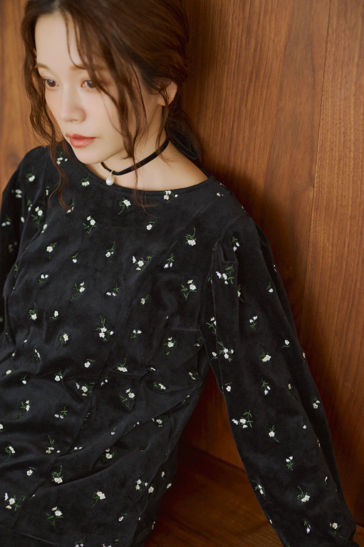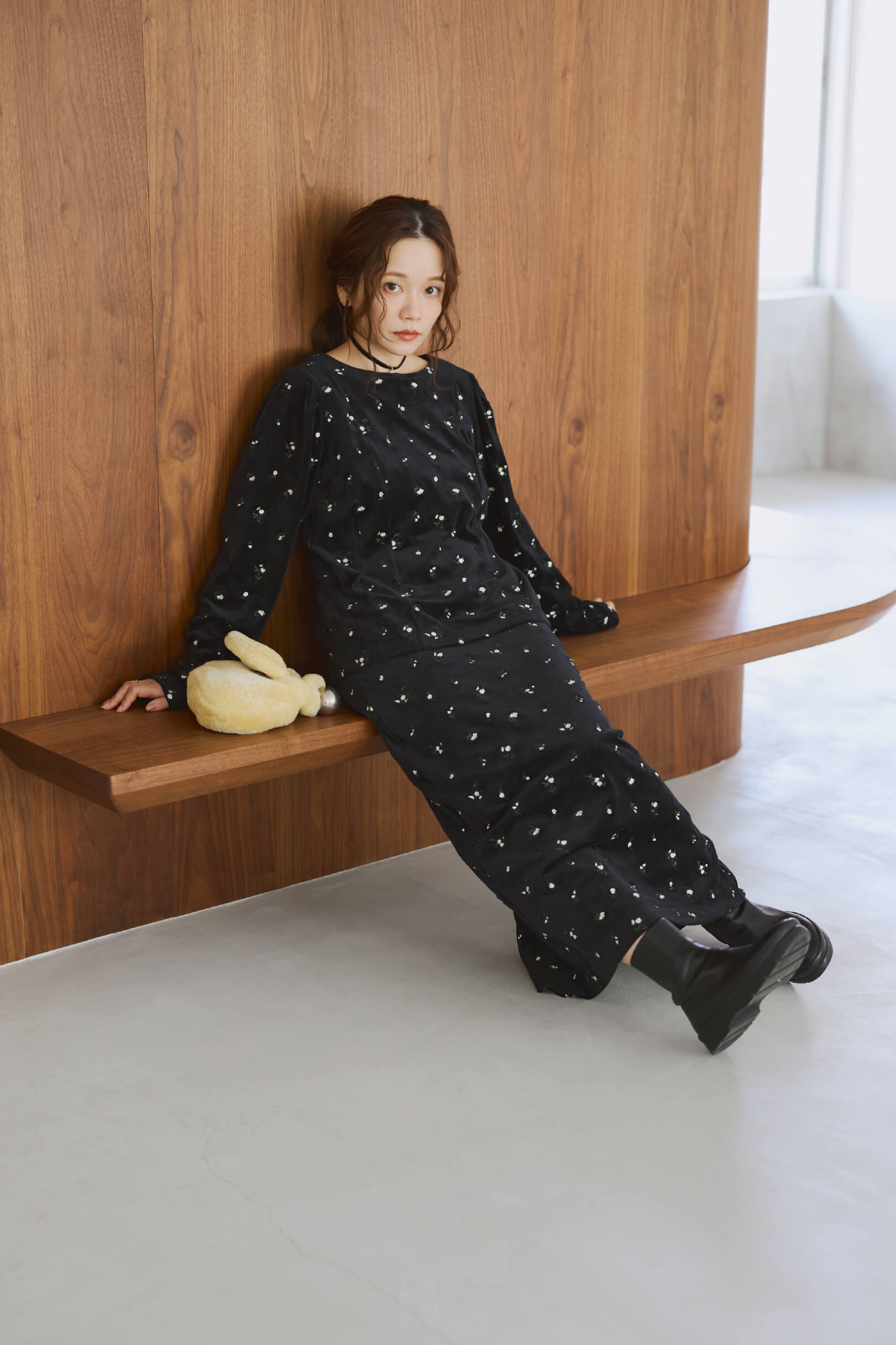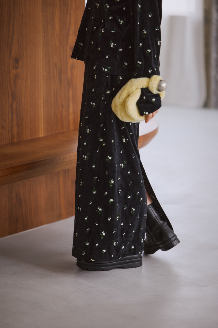 冬のお出かけにぴったりのベロアの花柄刺繍入りセットアップ。ロマンティックな生地に合わせて、上下ともにフェミニンなシルエットに。ボートネックやスカート裾のスリットなどで程よくヘルシーに。