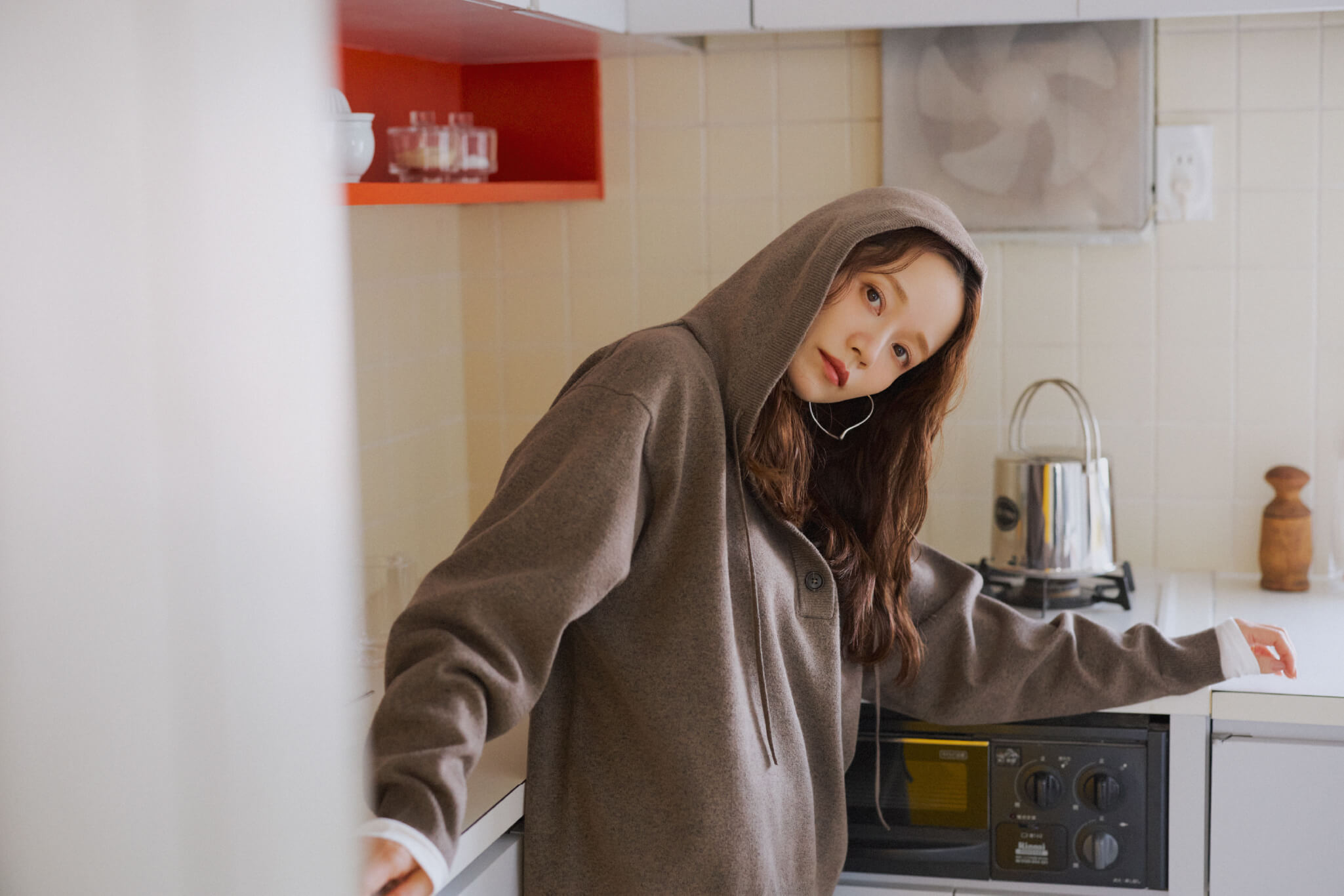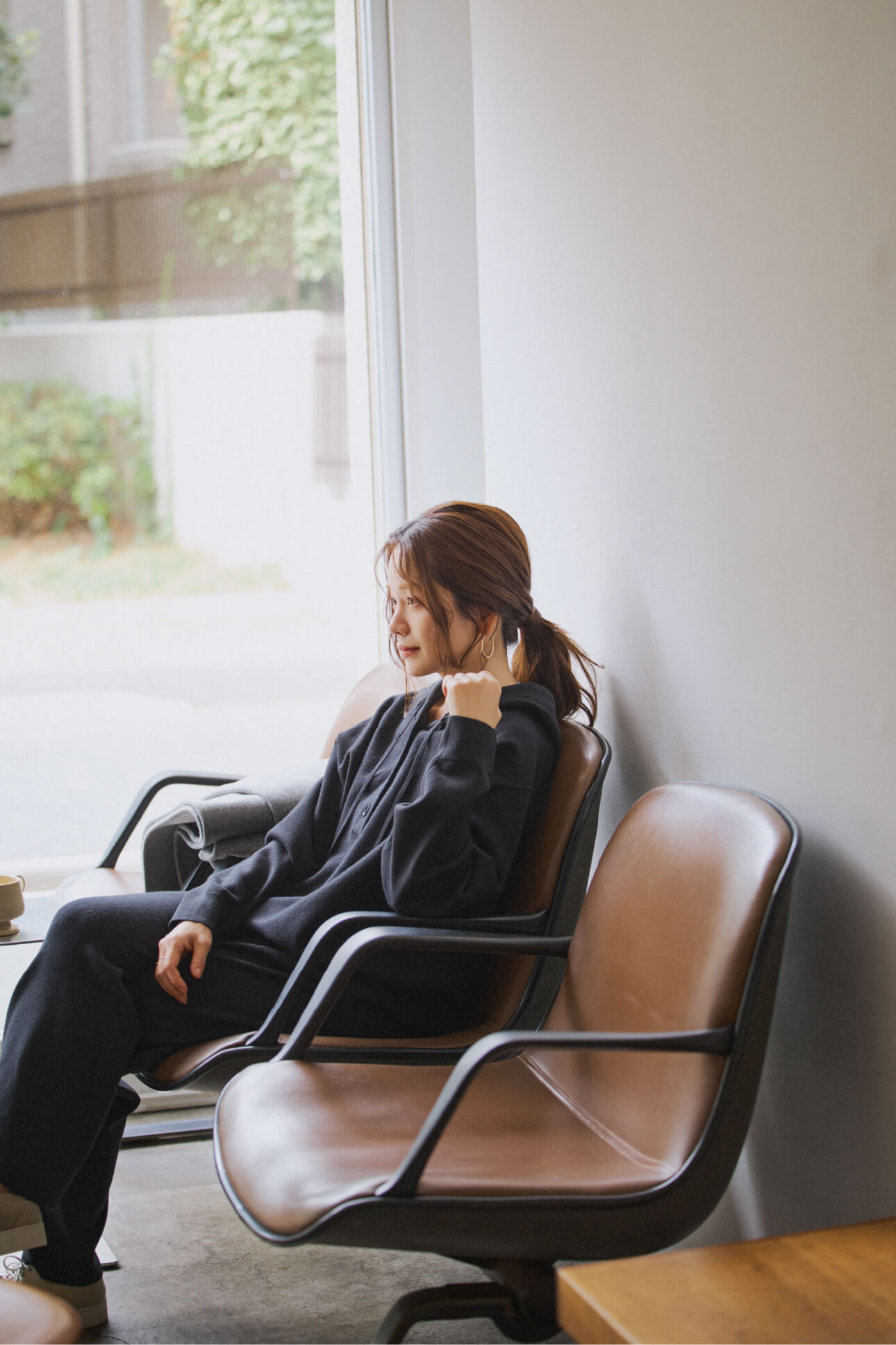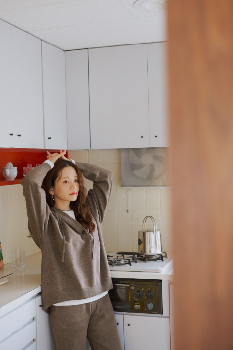 ふわふわの肌触りが自慢のニットセットアップ。フーディのボタンを開け、衿を抜いて着るとよりインナーとのレイヤードが楽しめる。トップスは前が短く、後ろが少し長い丈でゆるさの中にスタイルアップが叶う。