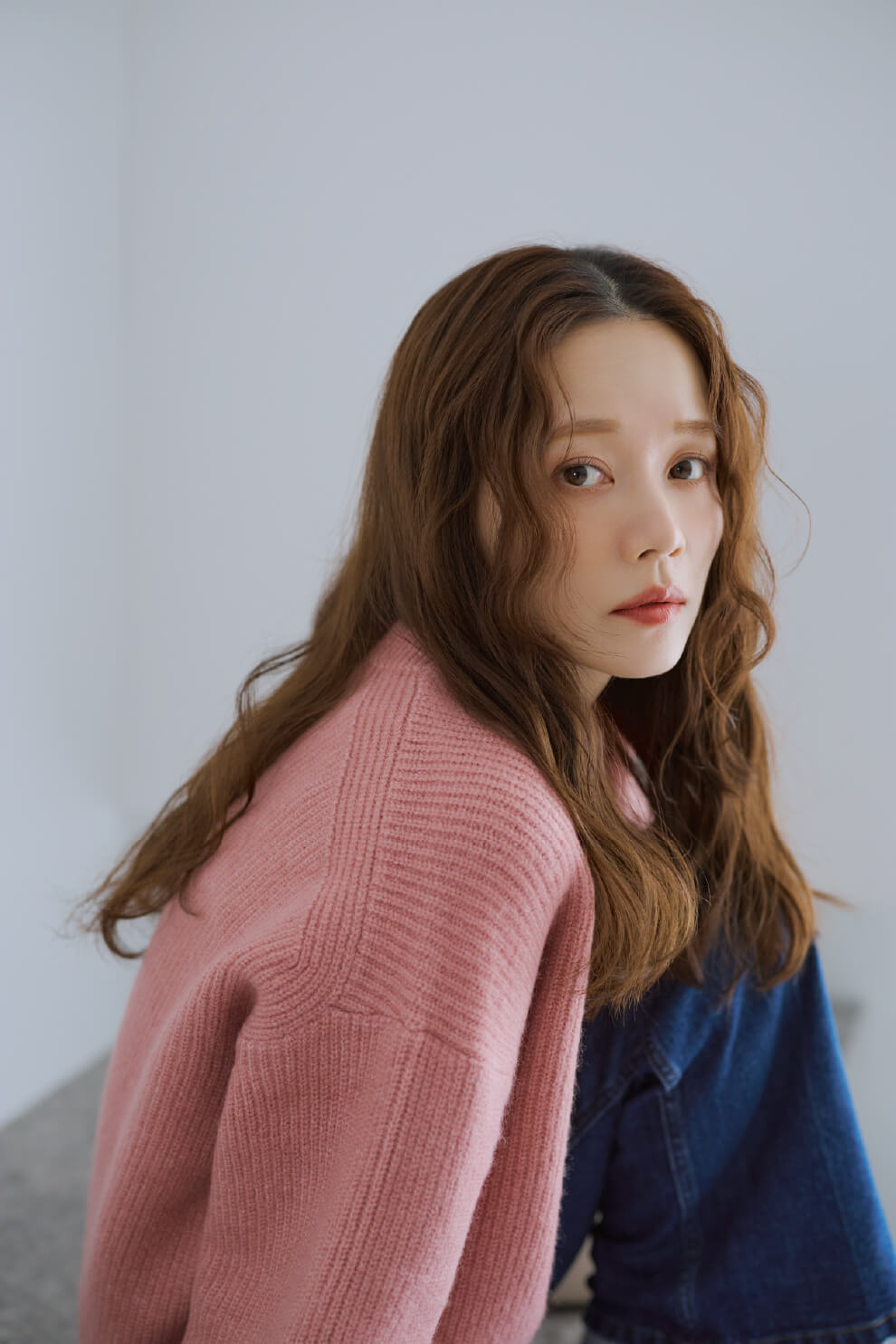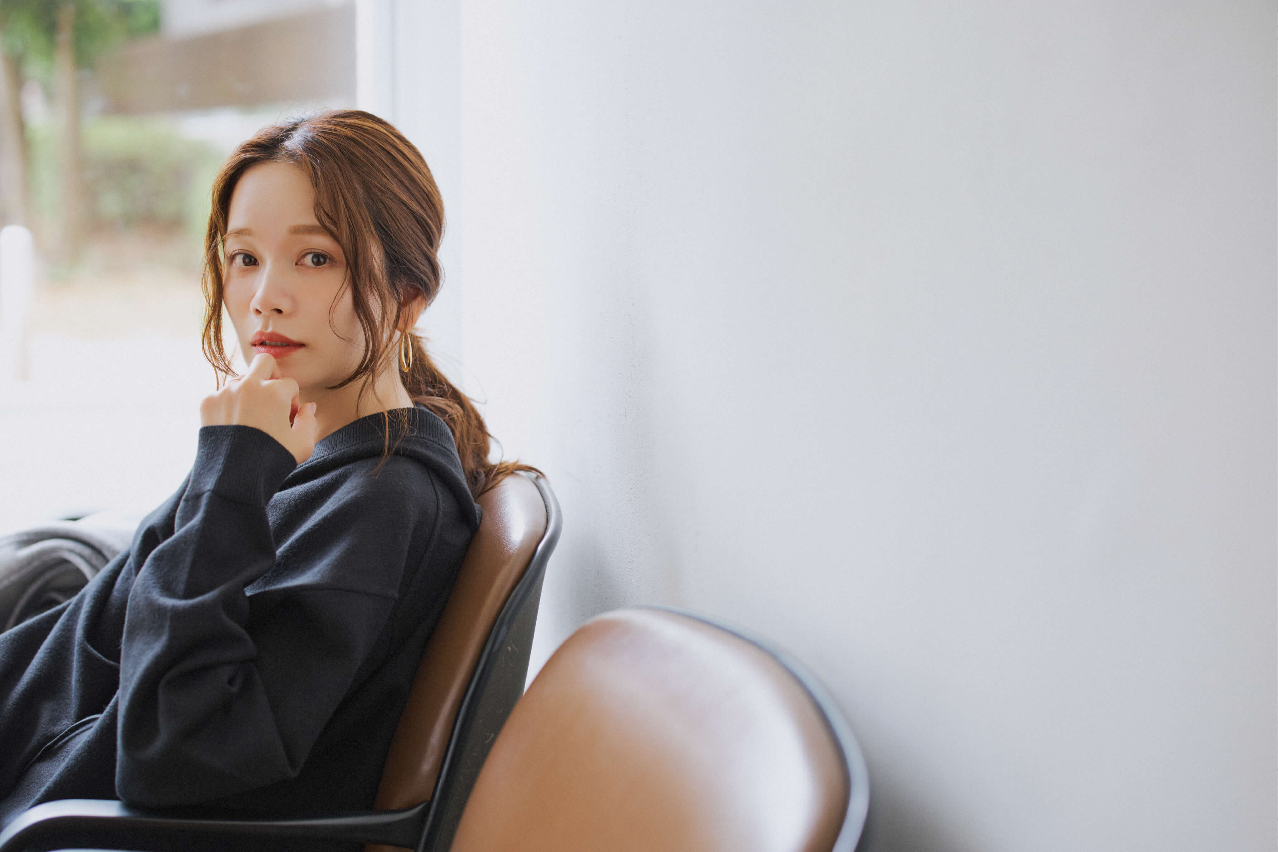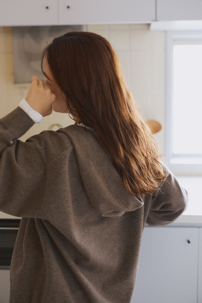 ふわふわの肌触りが自慢のニットセットアップ。フーディのボタンを開け、衿を抜いて着るとよりインナーとのレイヤードが楽しめる。トップスは前が短く、後ろが少し長い丈でゆるさの中にスタイルアップが叶う。
