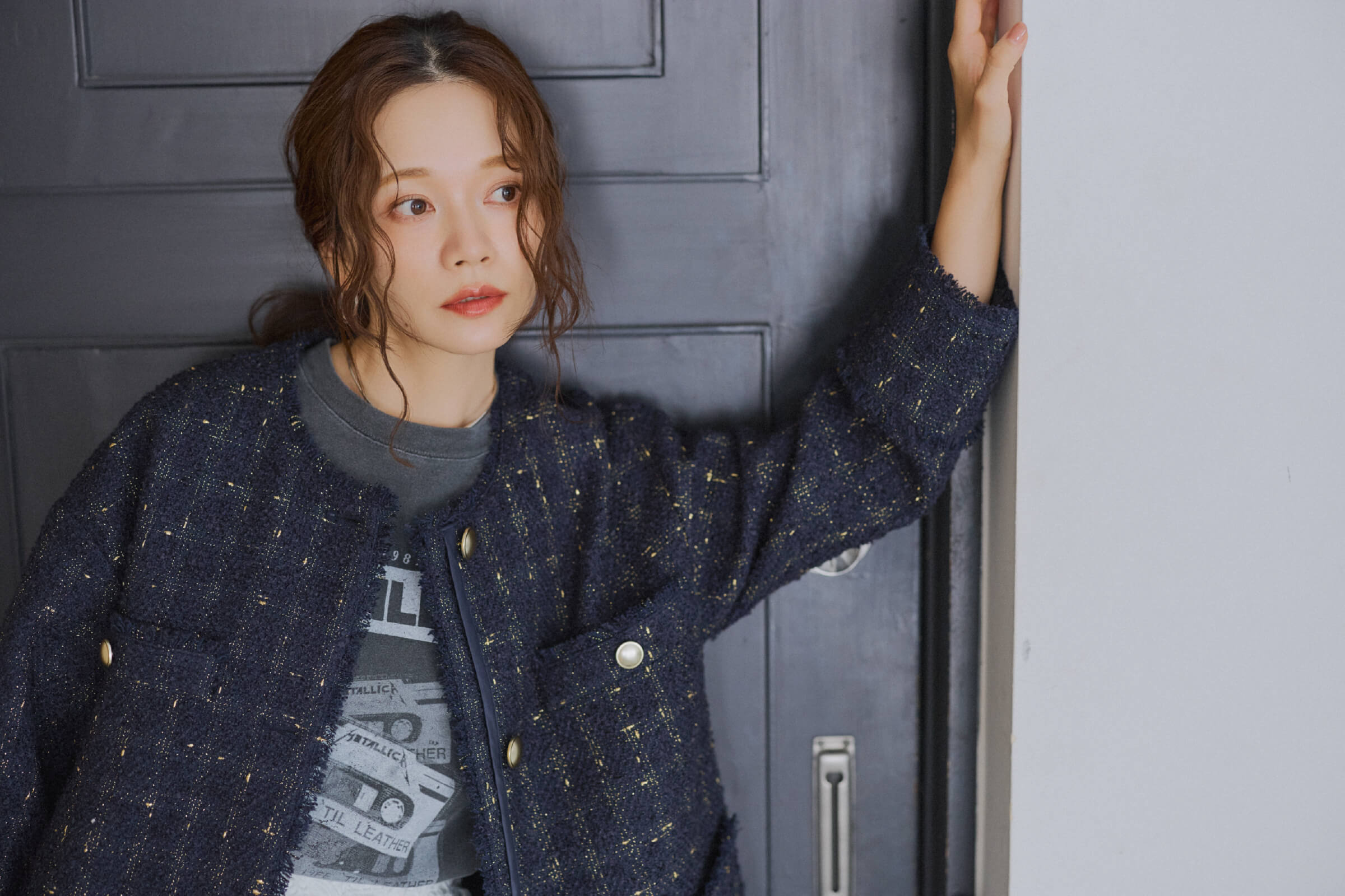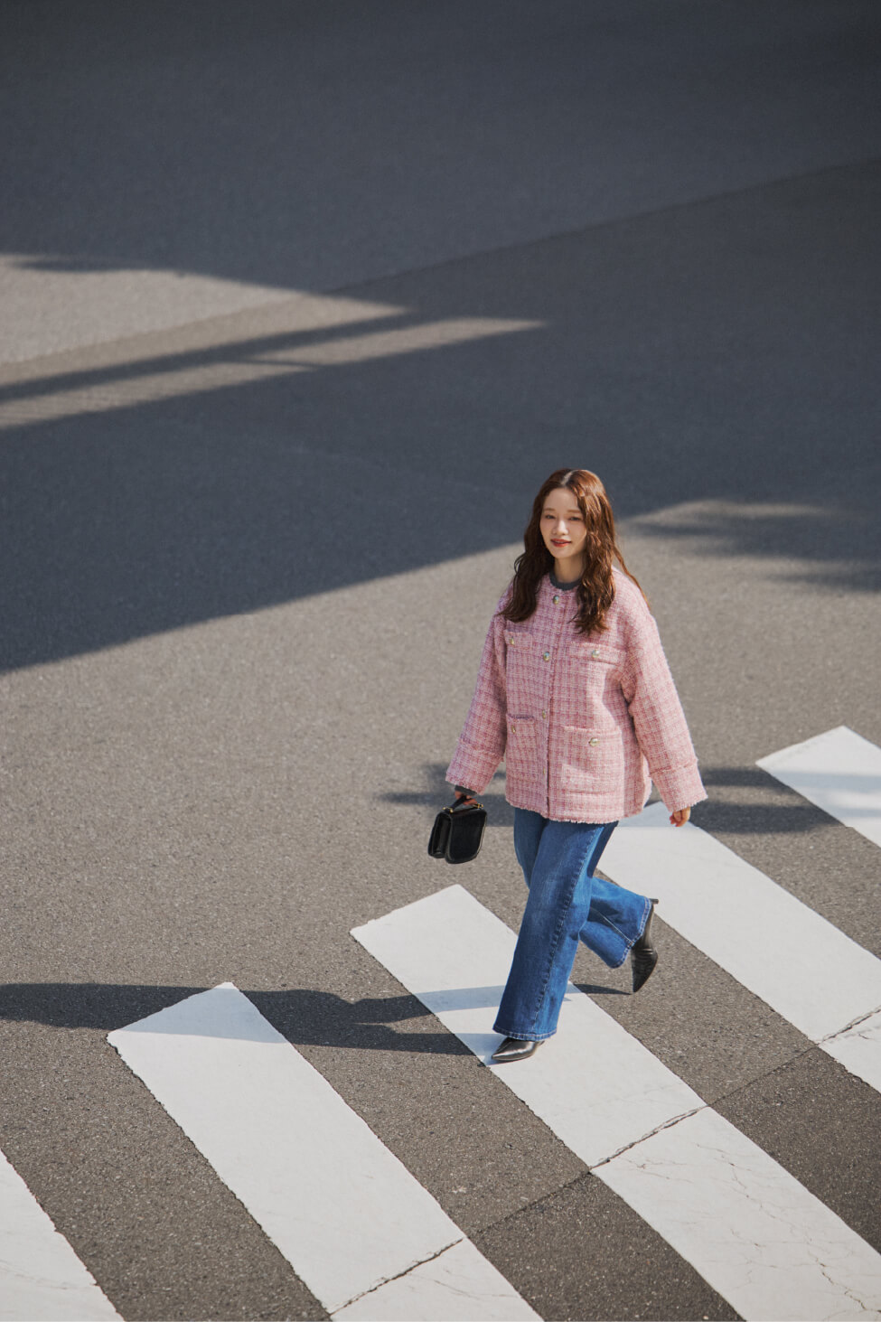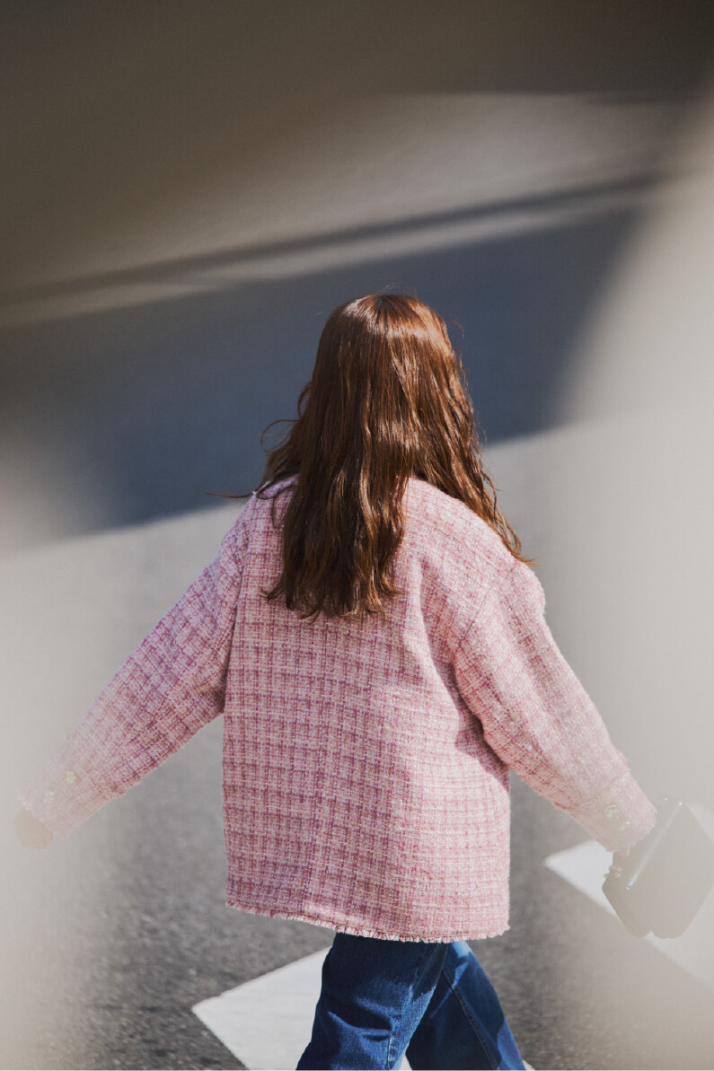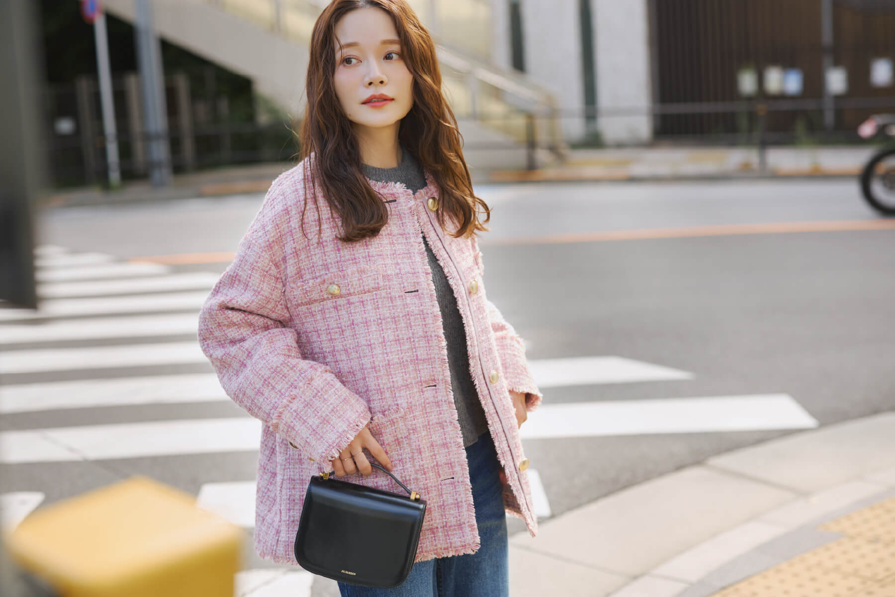 寒さを吹き飛ばしてくれるようなベビーピンクのツイードジャケットは、顔まわりを明るく仕上げてくれる。ニットやデニムでカジュアルダウンして、上品さとこなれ感の両方を手に入れて。