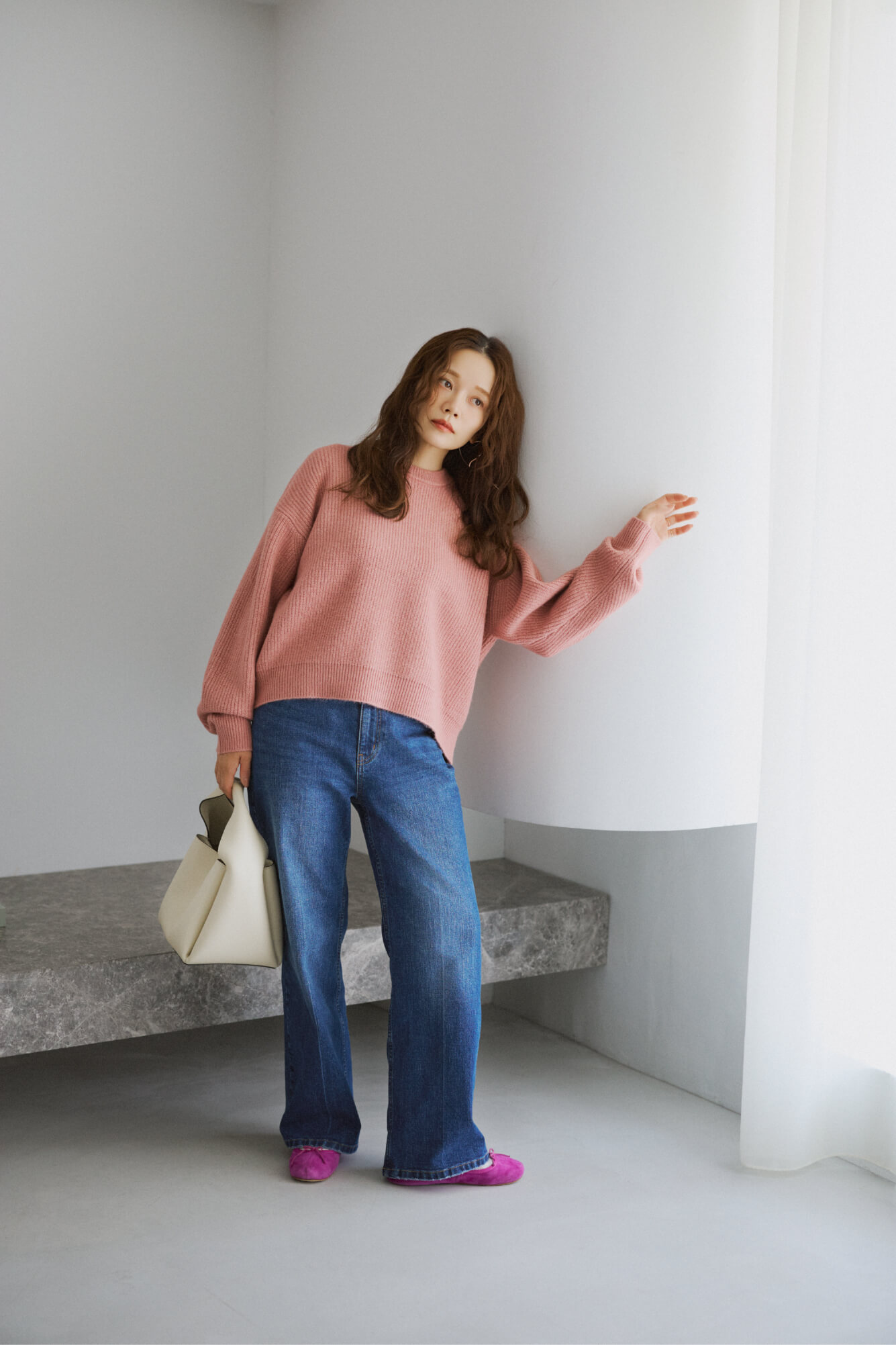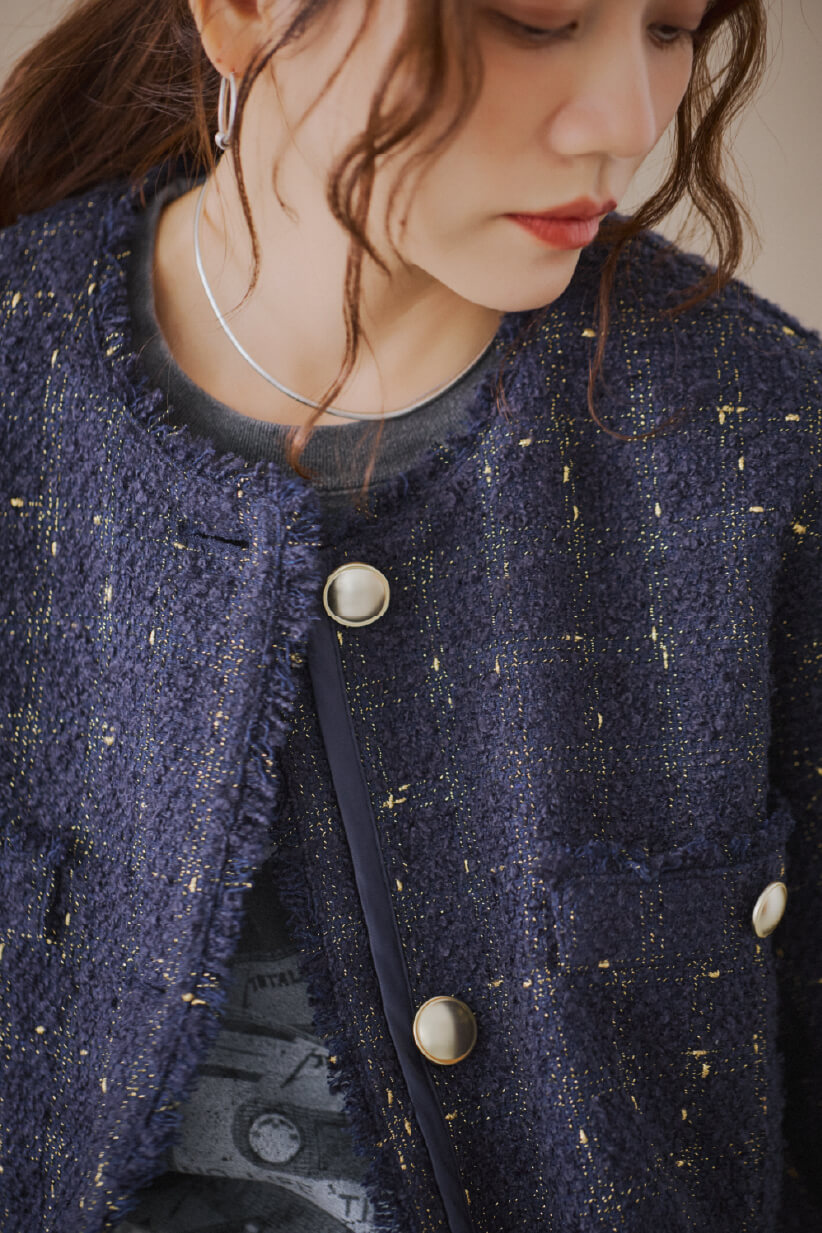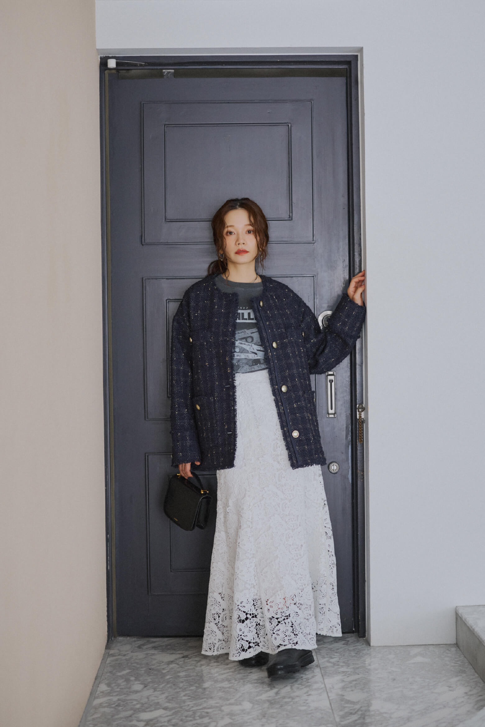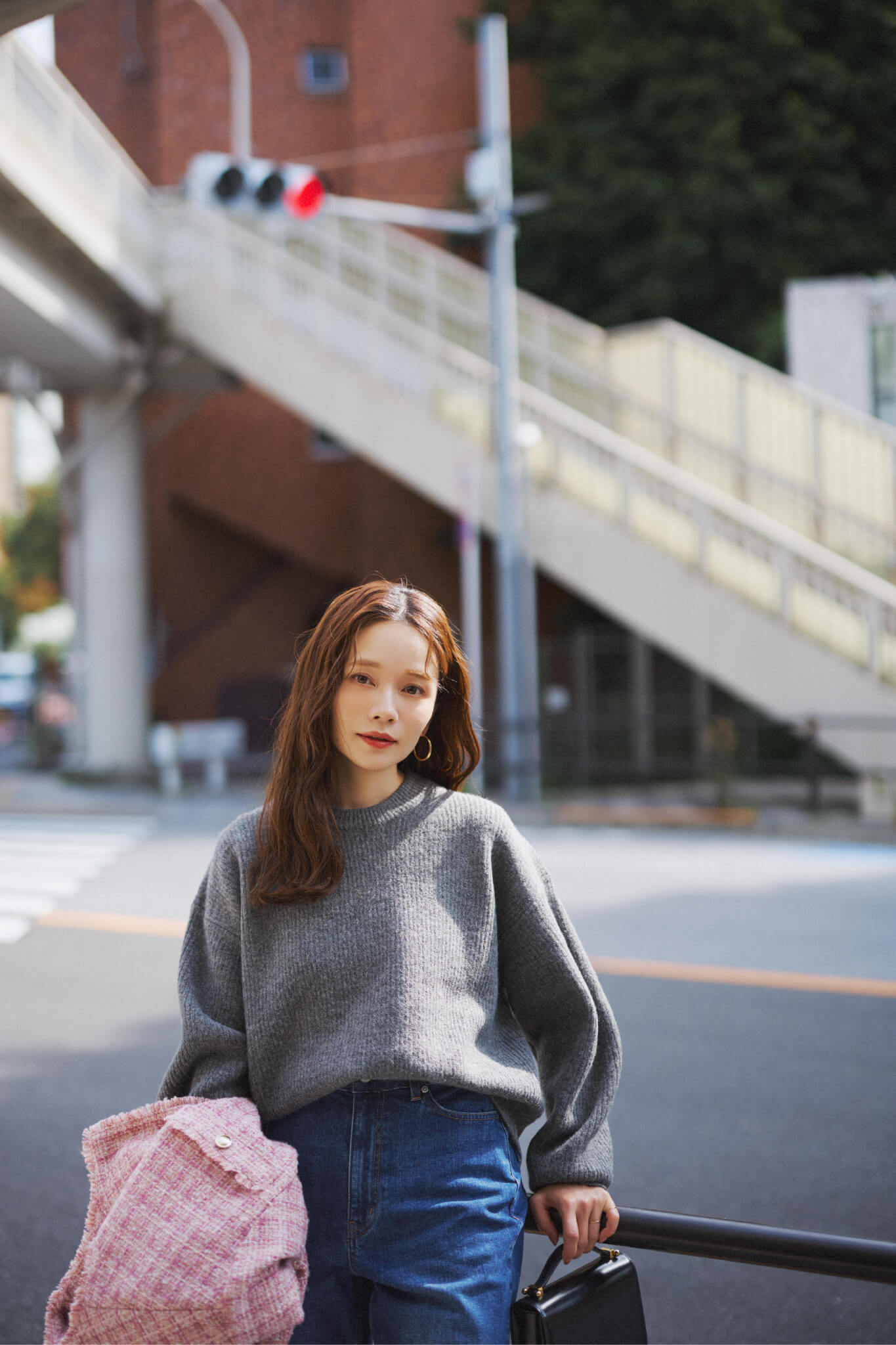 寒さを吹き飛ばしてくれるようなベビーピンクのツイードジャケットは、顔まわりを明るく仕上げてくれる。ニットやデニムでカジュアルダウンして、上品さとこなれ感の両方を手に入れて。