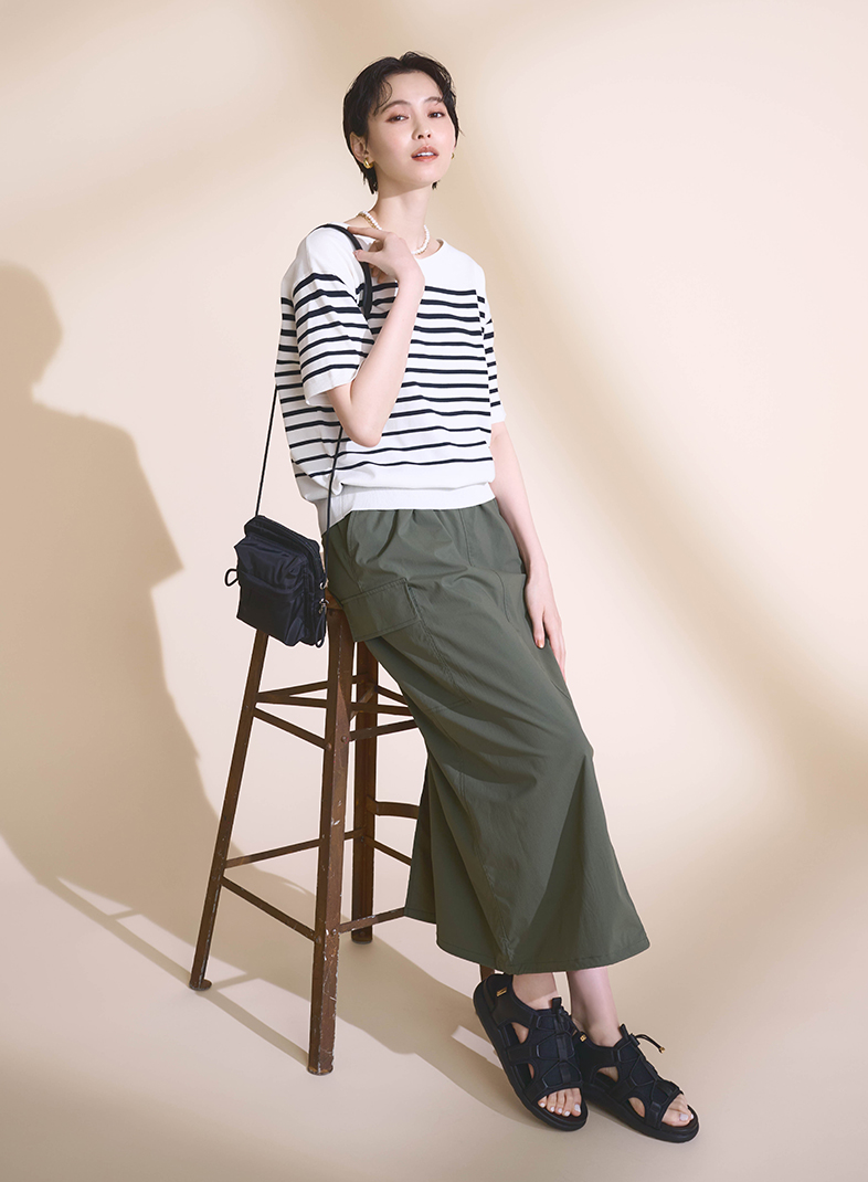 使いやすいVネックプルオーバーは、デコルテを際立て、膨張して見えがちなボーダー柄もスッキリ見せてくれます。大人のカジュアルはシックにまとめて。ロングのカーゴスカートやパールなどジュエリーを重ねて、レディな要素を加えると素敵に仕上がります。